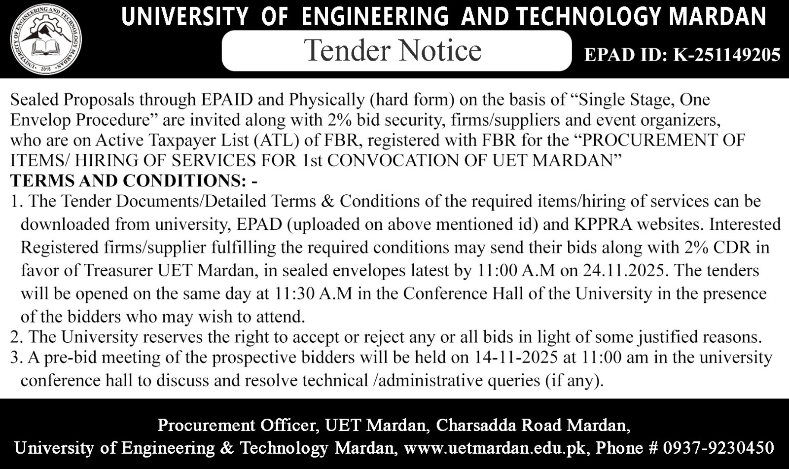 PROCUREMENT OF ITEMS/ HIRING OF SERVICES FOR 1st CONVOCATION OF UET MARDAN
