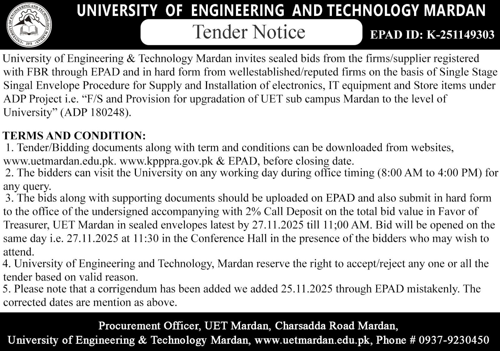 TENDER NOTICE ON PROCUREMENT OF STATIONARY ITEMS REQUIRED FOR THE MAIN STORE OF UET MARDAN