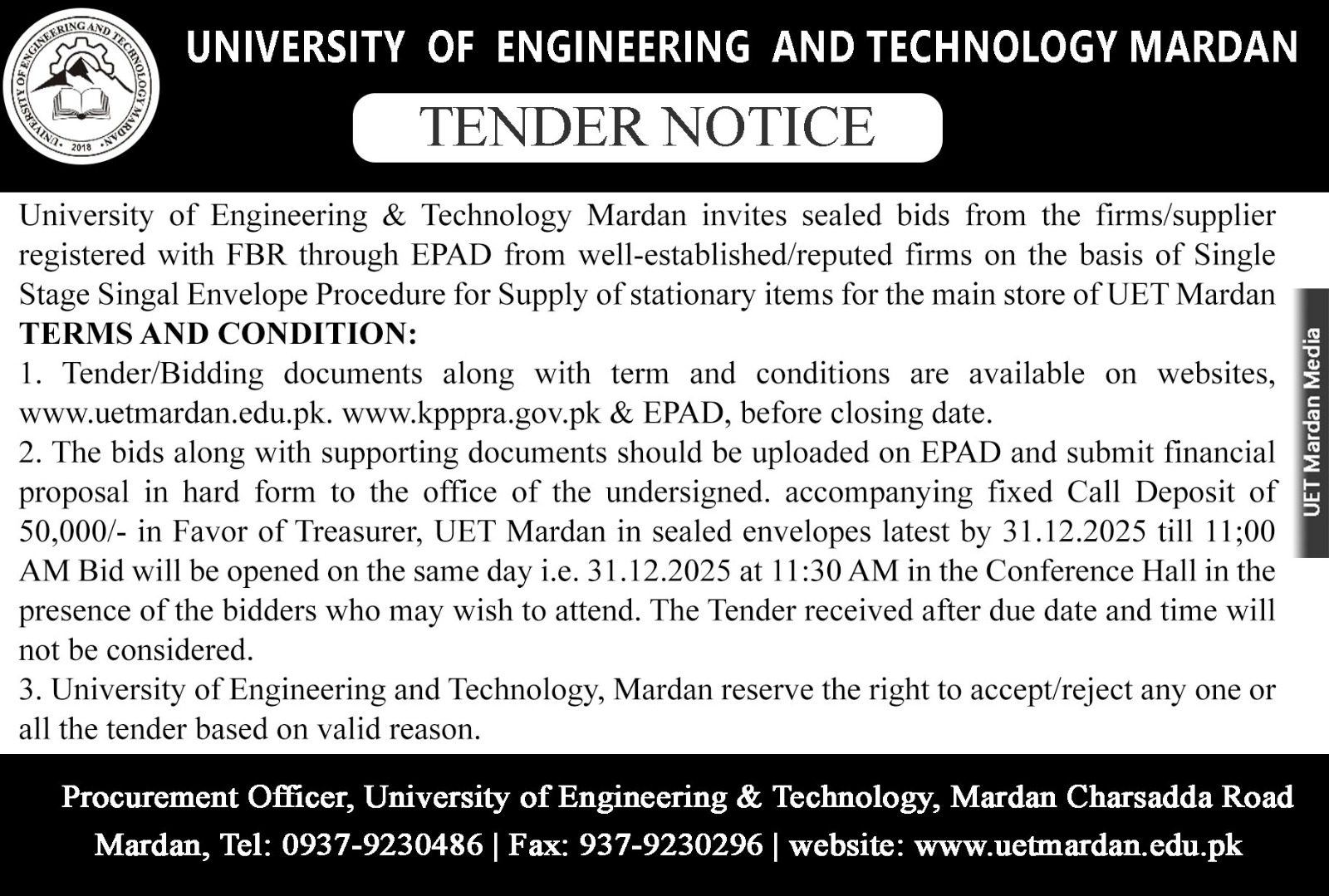 TENDER NOTICE ON PROCUREMENT OF STATIONARY ITEMS REQUIRED FOR THE MAIN STORE OF UET MARDAN