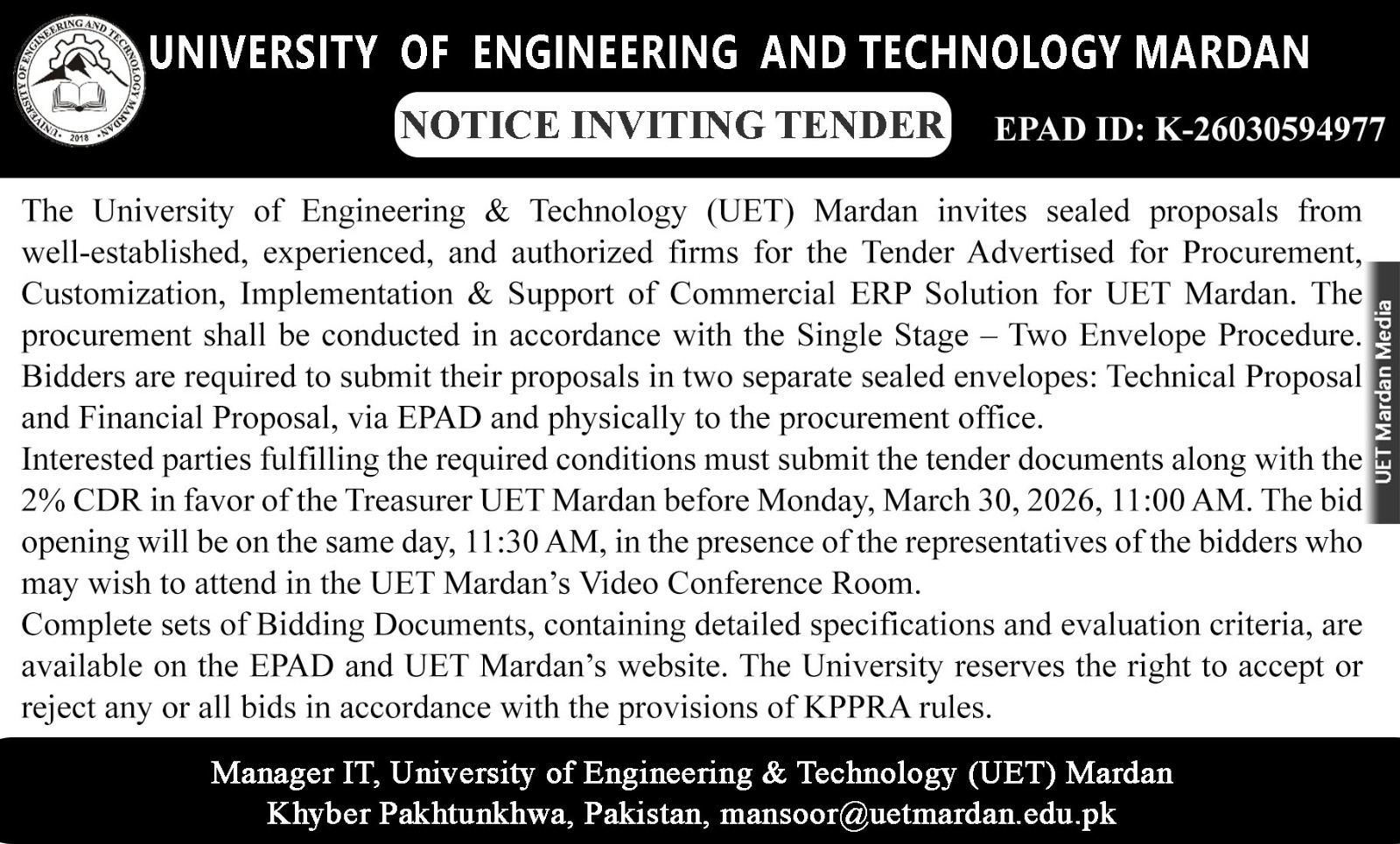 Tender Advertised for Procurement, Customization, Implementation & Support of Commercial ERP Solution for UET Mardan