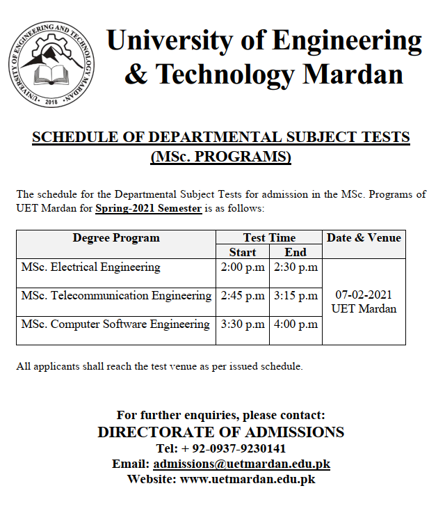 Schedule of Departmental Subject Test for MSc (Spring-2021)
