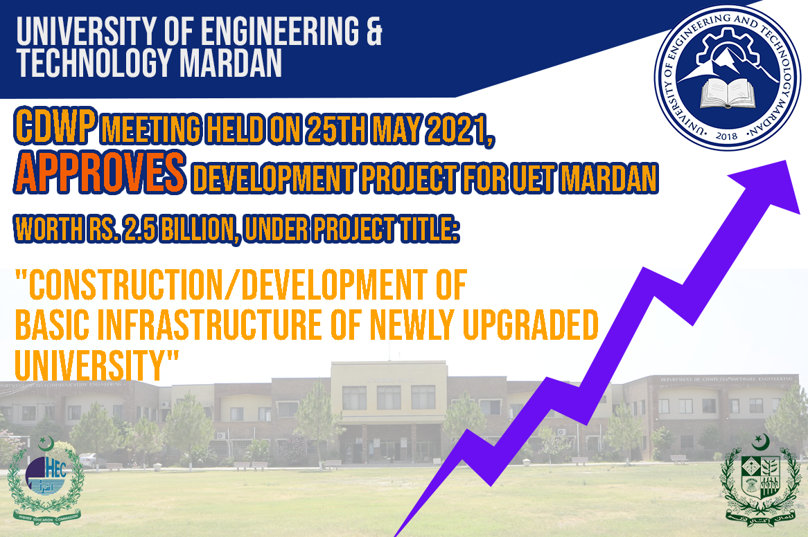 In a recent CDWP meeting, held on 25 May 2021 presided over by Deputy Chairman Planning Commission Dr. Mohammad Jehanzeb Khan, approved Project namely "construction/development of basic infrastructure of newly upgraded University (University of Engineering &Technology Mardan) worth Rs. 2.50 Billion. Meanwhile, senior officials from the planning commission, federal ministries/divisions, representatives from the provincial government, Vice-chancellor UET Mardan Dr. Shahid Khattak, and his technical team participated while Executive Director, Higher Education commission Dr. Shaista Sohail participated through video conference. After a detailed discussion, the forum collectively approved the project for the strengthening and establishment of UET Mardan; the second public sector engineering university in Khyber Pakhtunkhwa province.