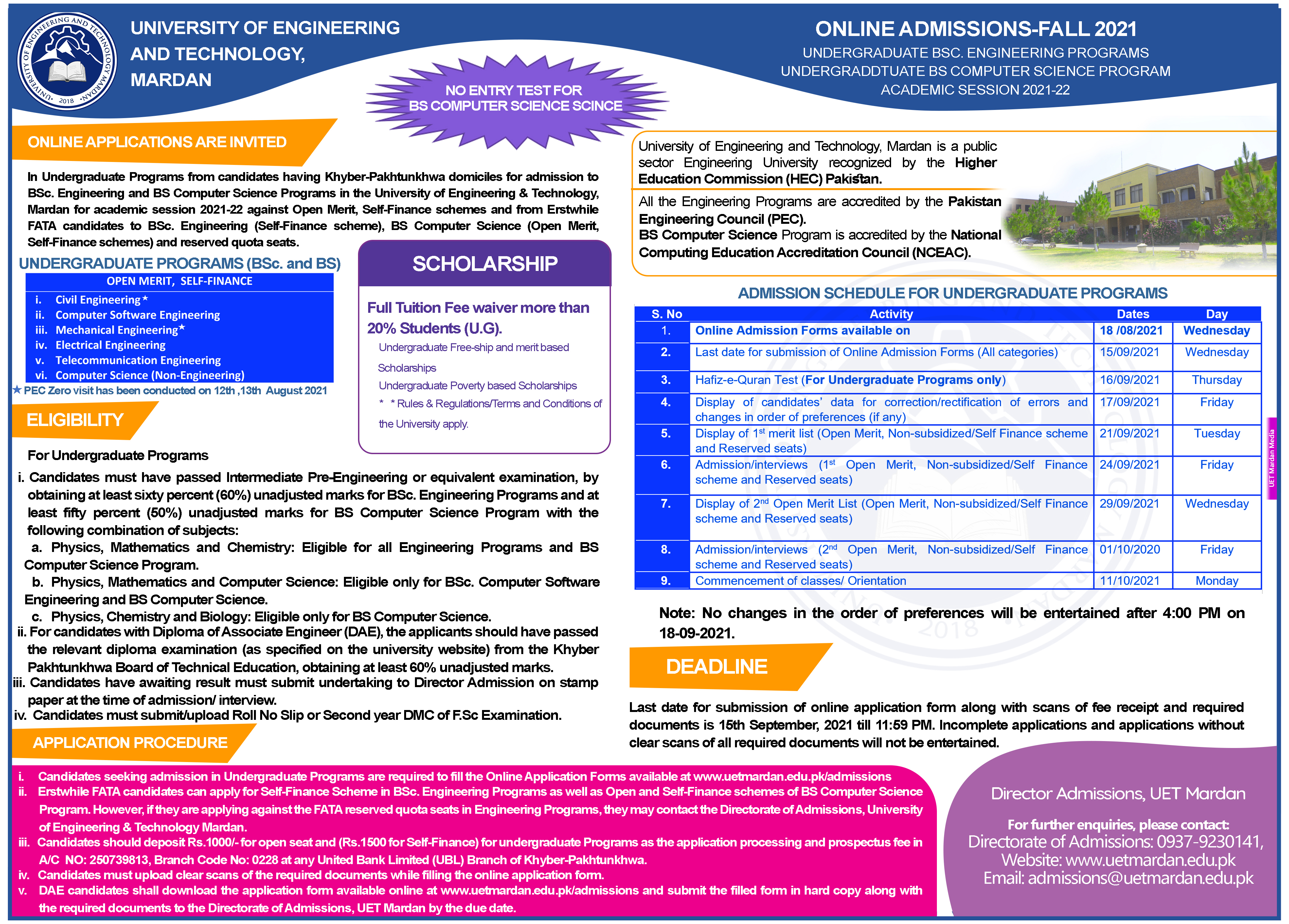 B.Sc. Programs Admission Open at UET Mardan For Session 2021-22