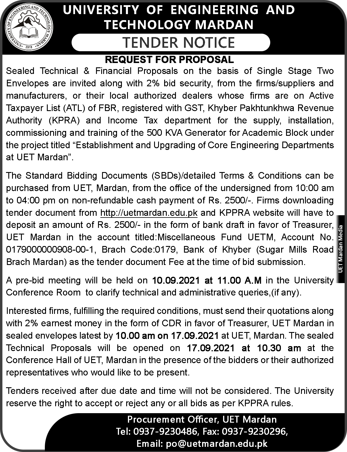 Tender Notice for "The Supply, Installation, Commissioning and Training of the 500 KVA Generator for Academic Block"