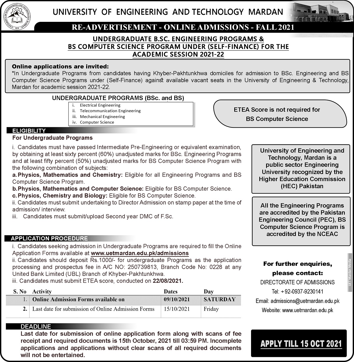 Admissions to B.Sc Engineering & BS Computer Science Programs for Self-finance Seats