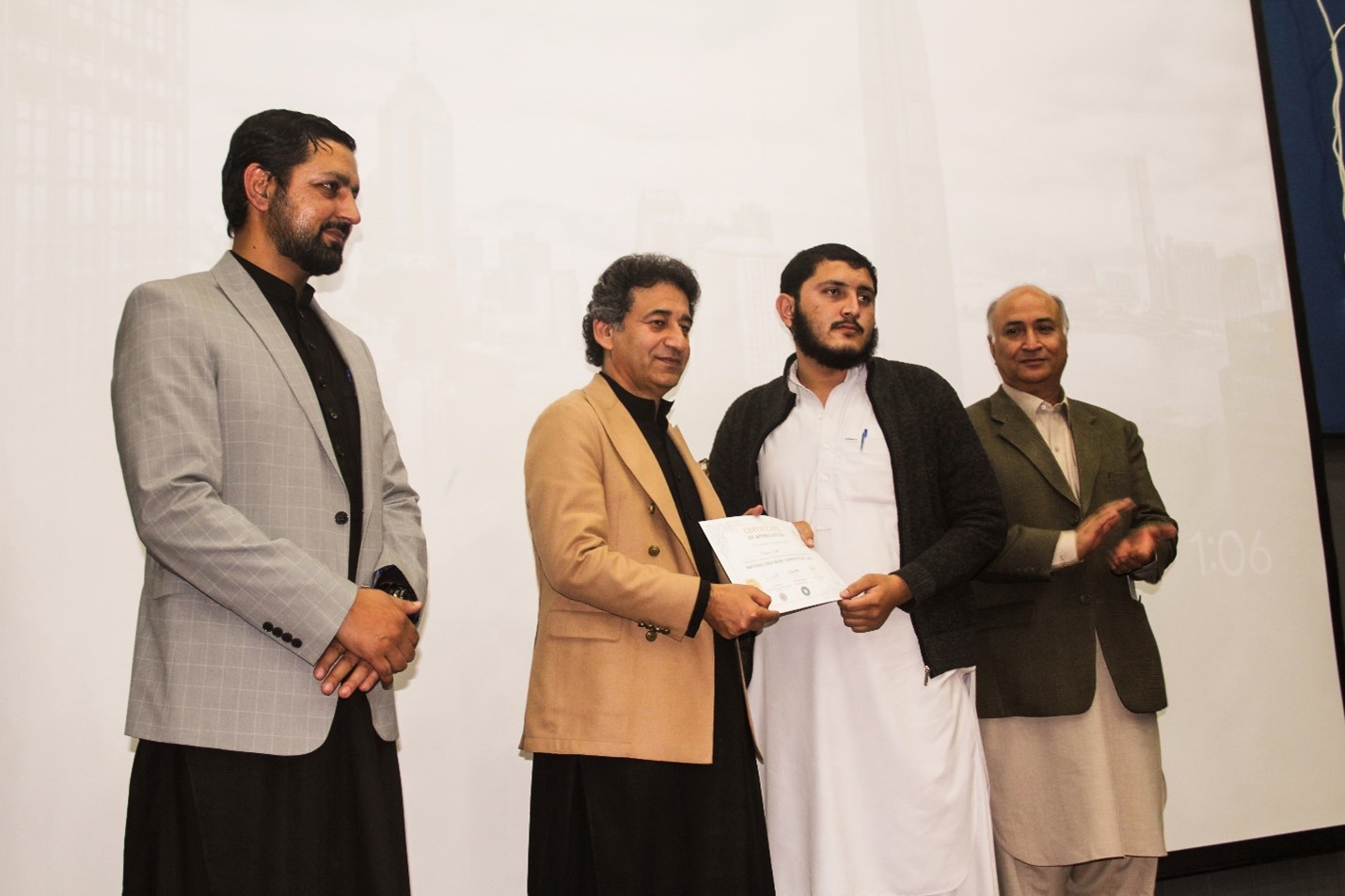 National Idea Bank Pakistan is a Collaboration between Academia, Government, Industry, and Society to Identify and Showcase Innovative Ideas to Solve Indigenous Problems. One of the students of the Department of Computer Software Engineering Rahim Ullah pitched an idea on 20th October 2021 to make a system for blood donation. The main aim of this system is to provide blood to needy people on an urgent basis. The top twelve ideas were selected by the health sector and Mr. Rahim Ullah stood first among all. The prize distribution ceremony was held at USPCAS-E UET Peshawar Phase-5, Hayatabad. Mr. Rahim Ullah received an appreciation certificate and 5000 cash prize from the Minister of Science and Technology, Mr. Atif Khan.
