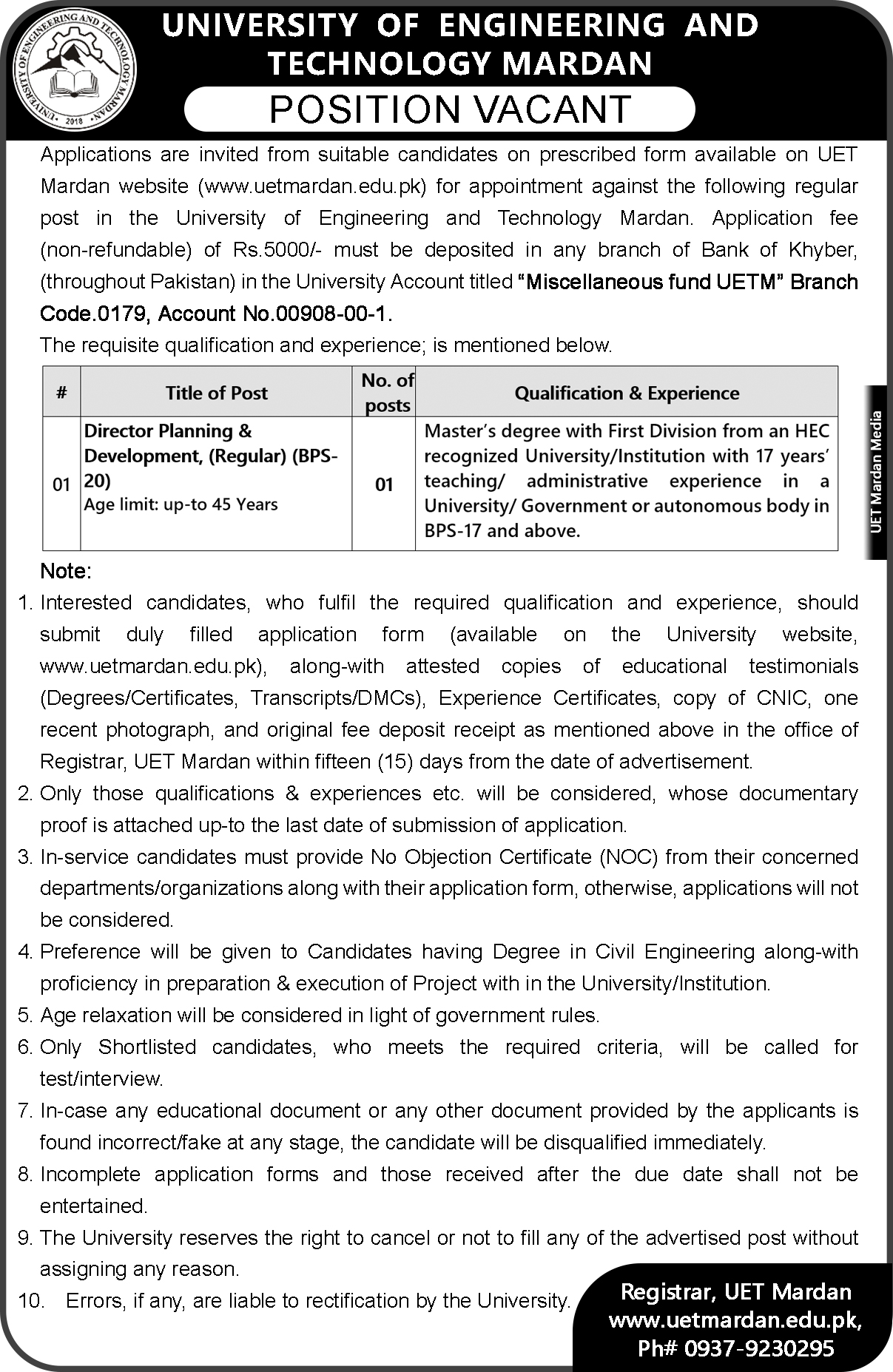 Scruitny of the Candidates for the Position of Treasurer (BPS-20) on Three Years Contract Basis in in UET Mardan