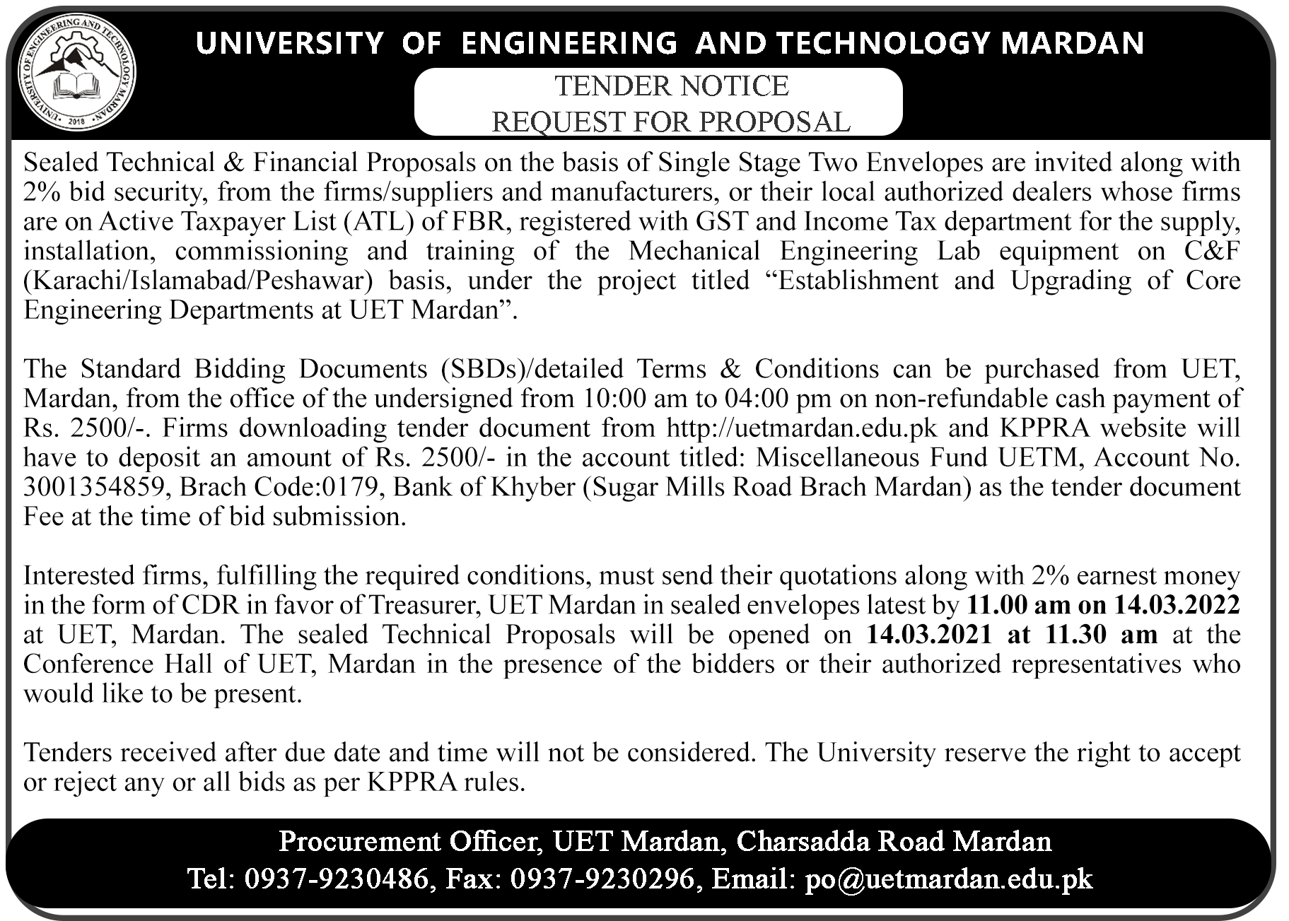 Tender Notice for " the Supply, Installation, Commissioning and Training of the Mechanical Engineering Lab equipment on C&F Basis"