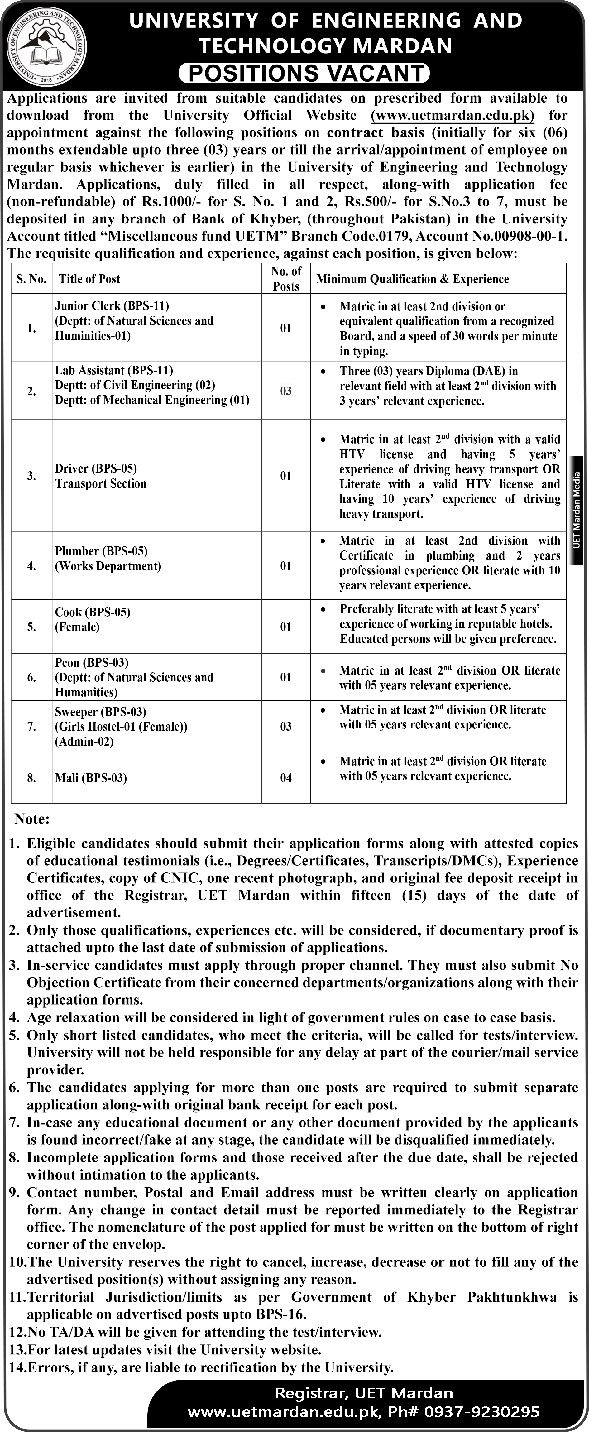 Scruitny of the Candidates for the Position of Treasurer (BPS-20) on Three Years Contract Basis in in UET Mardan