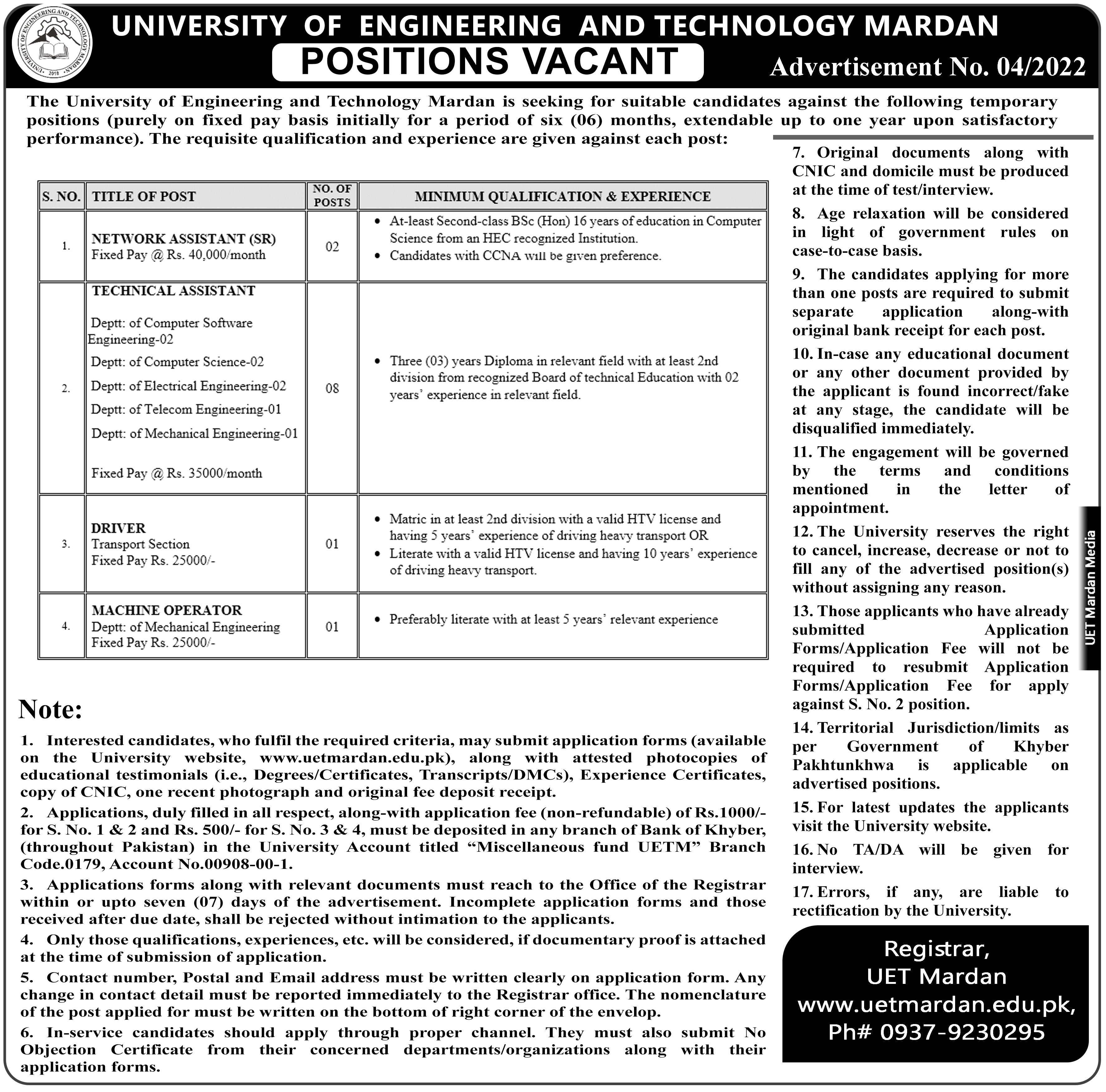 Scruitny of the Candidates for the Position of Treasurer (BPS-20) on Three Years Contract Basis in in UET Mardan