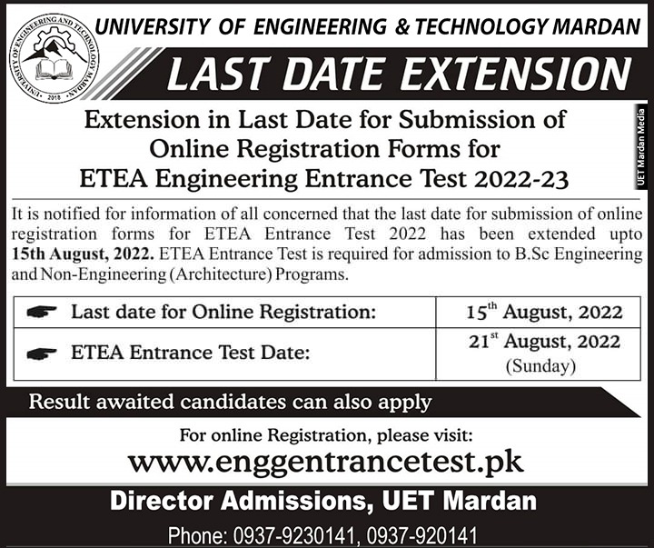 Extension in Last Date for Submission of Online Registration Forms for ETEA Engineering Entrance 2022- 23 Last Date for Online Registration: 05th August 2022