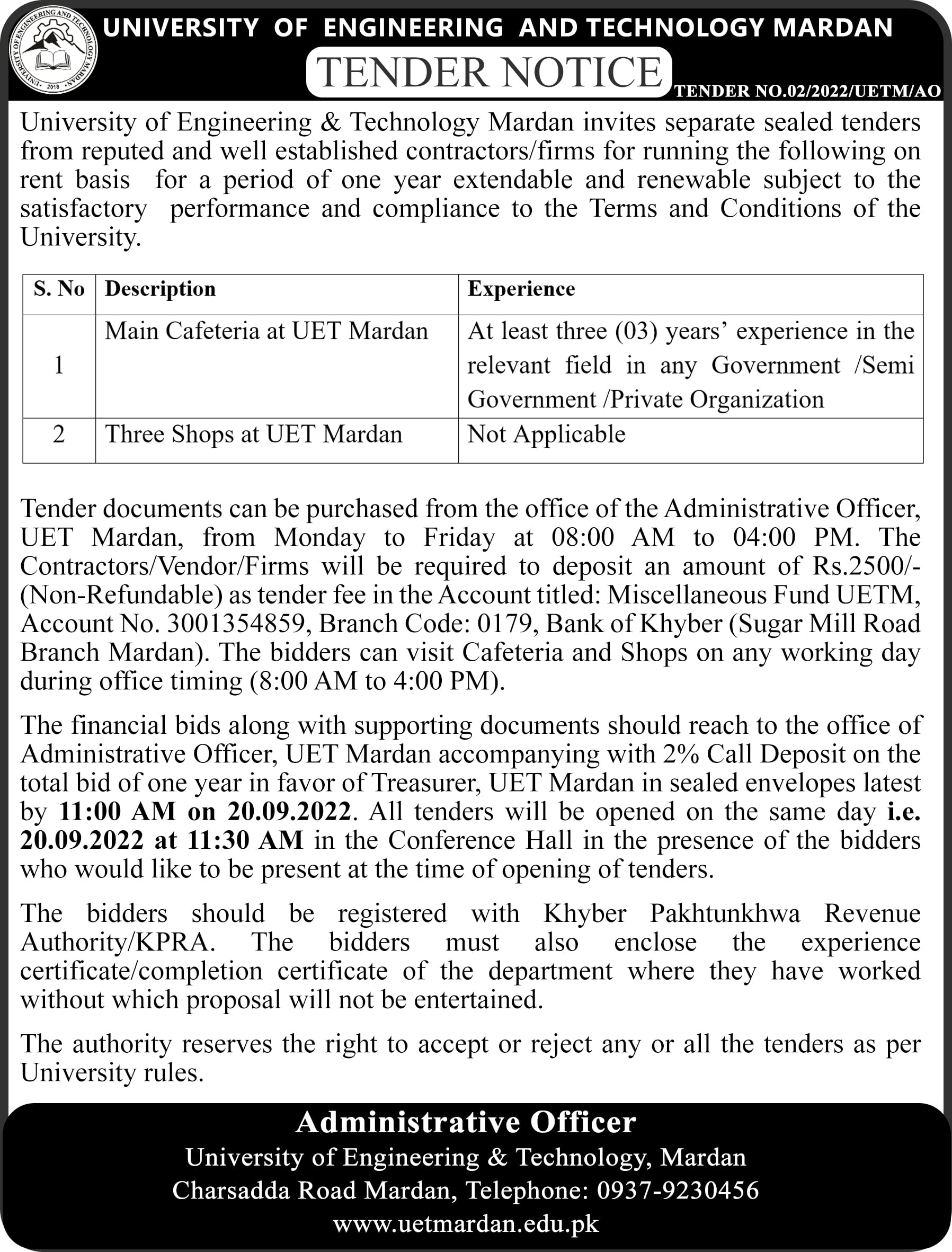 Tender Notice for Shops & Cafeteria