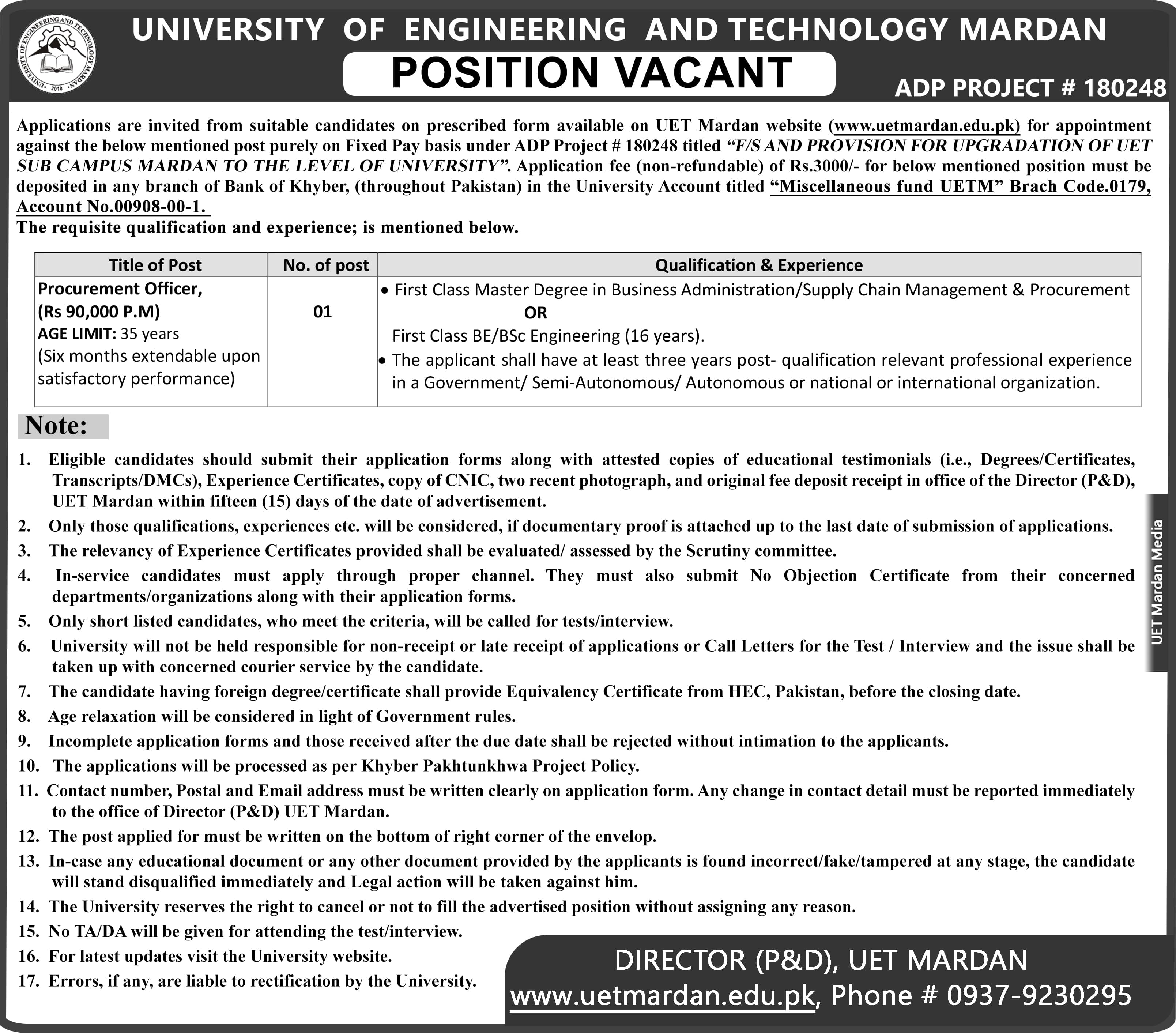 Scruitny of the Candidates for the Position of Treasurer (BPS-20) on Three Years Contract Basis in in UET Mardan