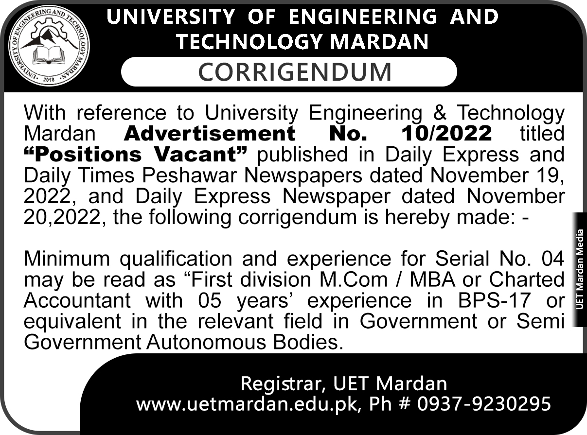 Scruitny of the Candidates for the Position of Treasurer (BPS-20) on Three Years Contract Basis in in UET Mardan