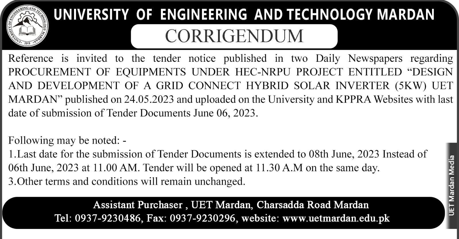 Tender corrigendum for DESIGN AND DEVELOPMENT OF A GRID CONNECT HYBRID SOLAR INVERTER (5KW) UET MARDAN”