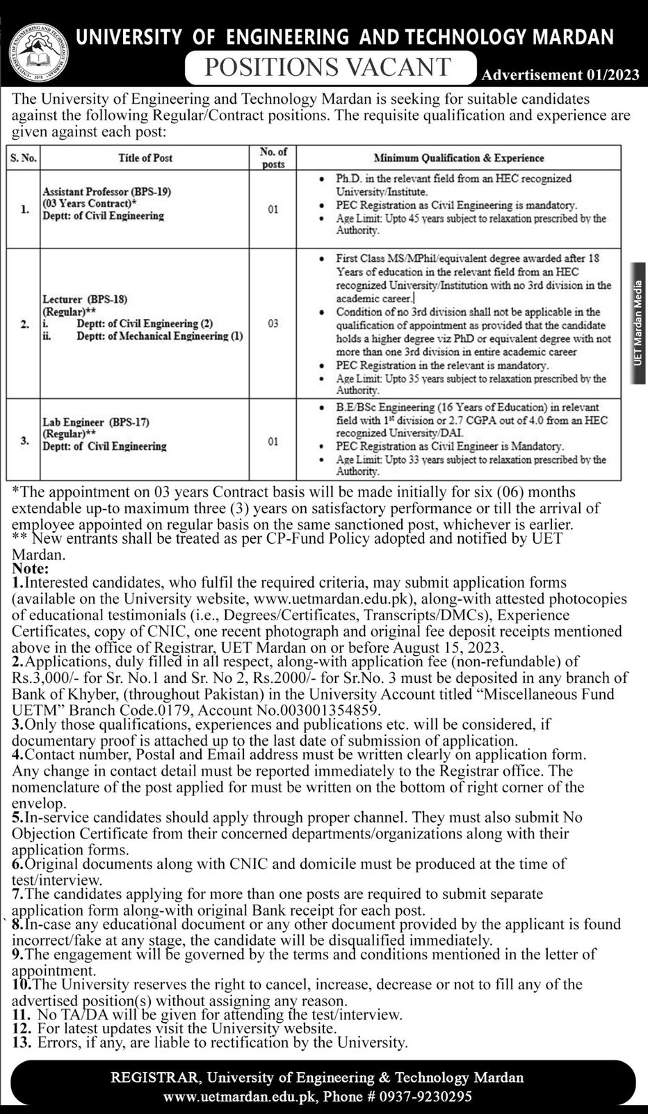 Scruitny of the Candidates for the Position of Treasurer (BPS-20) on Three Years Contract Basis in in UET Mardan