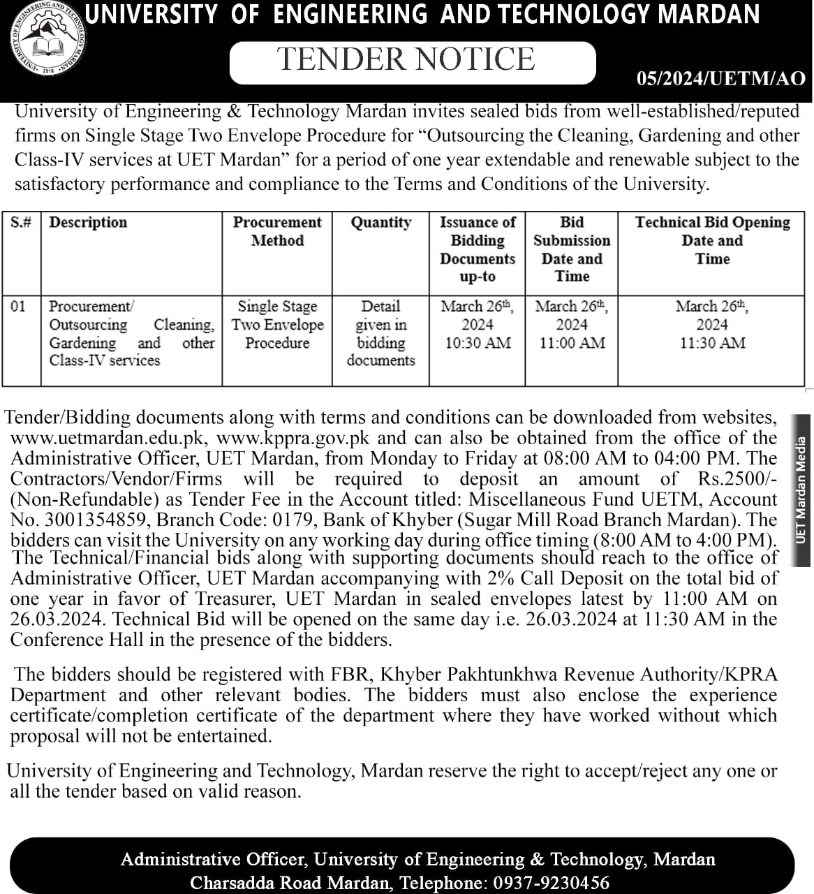 Tender Notice for “Outsourcing the Cleaning, Gardening and other Class-IV services at UET Mardan”