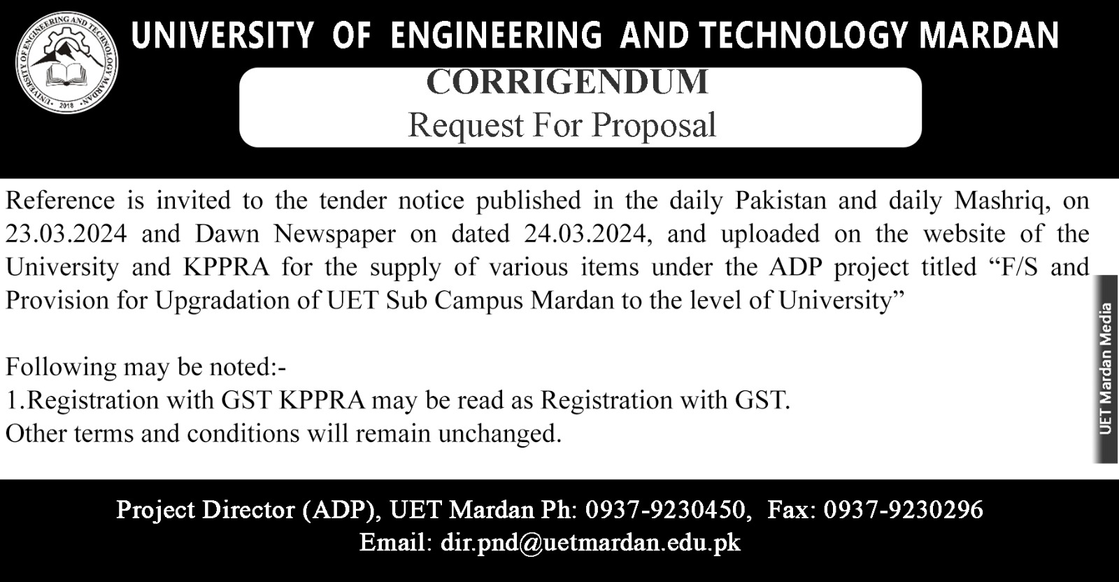 Corrigendum for the tender " F/S and Provision for Upgradation of UET Sub Campus Mardan to the level of University”