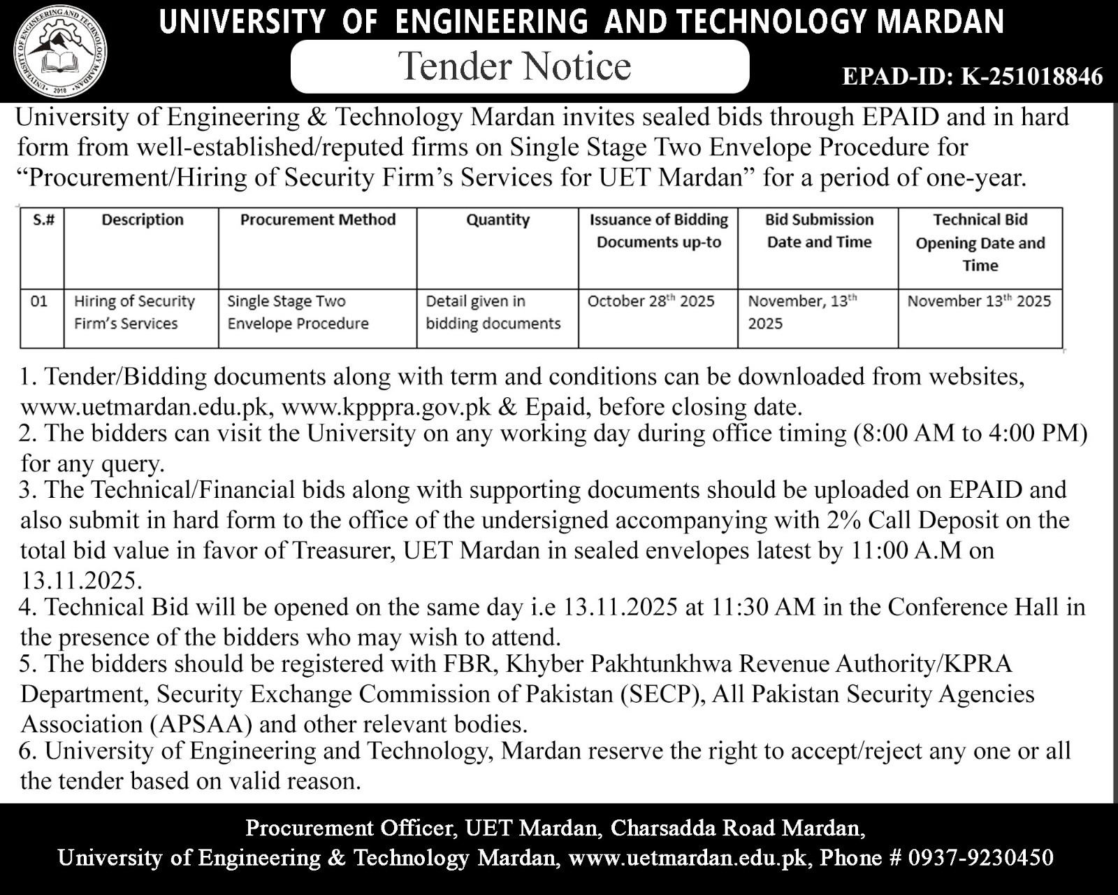 Single Stage Two Envelope Procedure for Procurement/Hiring of Security Firm's Services for UET Mardan