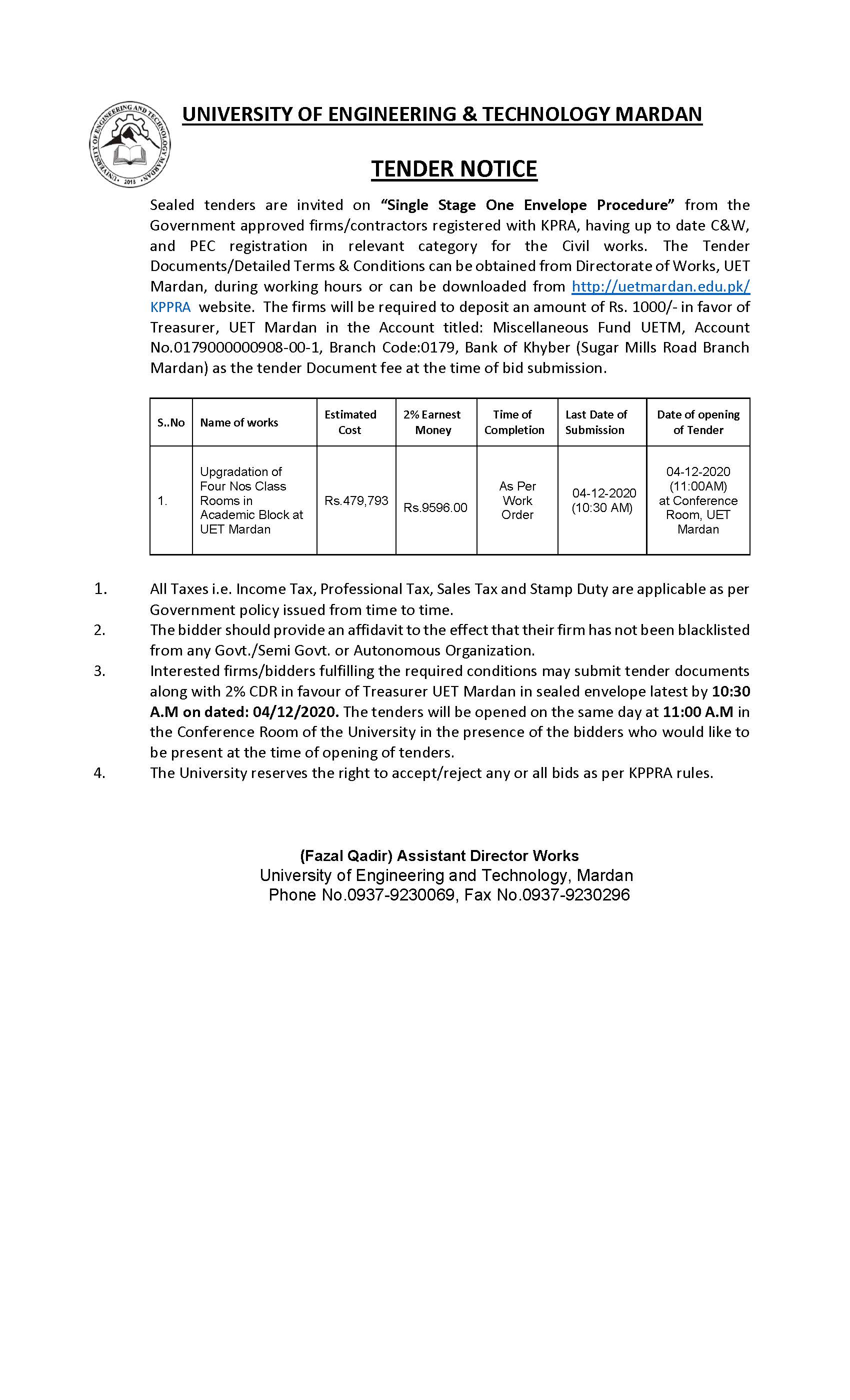 Tender Notice for Classrooms Upgradation