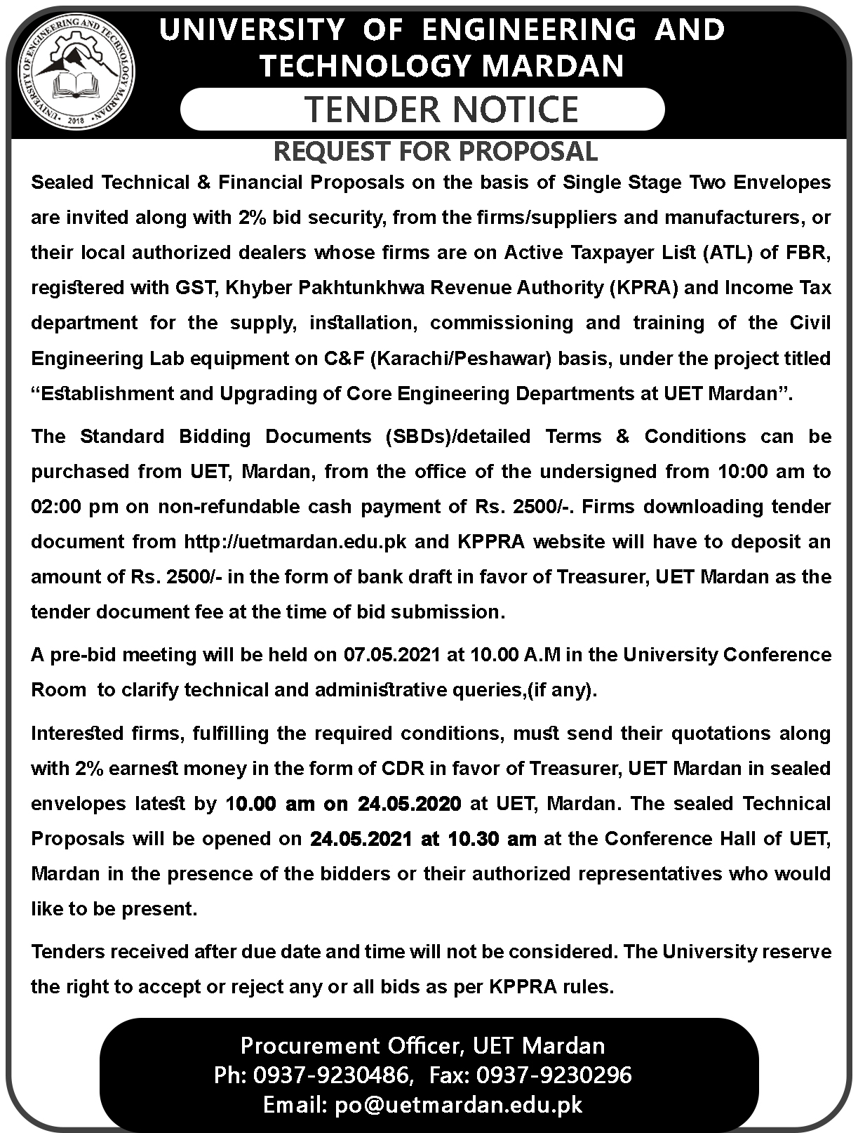 Tender Notice for Supply, installation, commissioning and training of the Civil Engineering Lab equipment